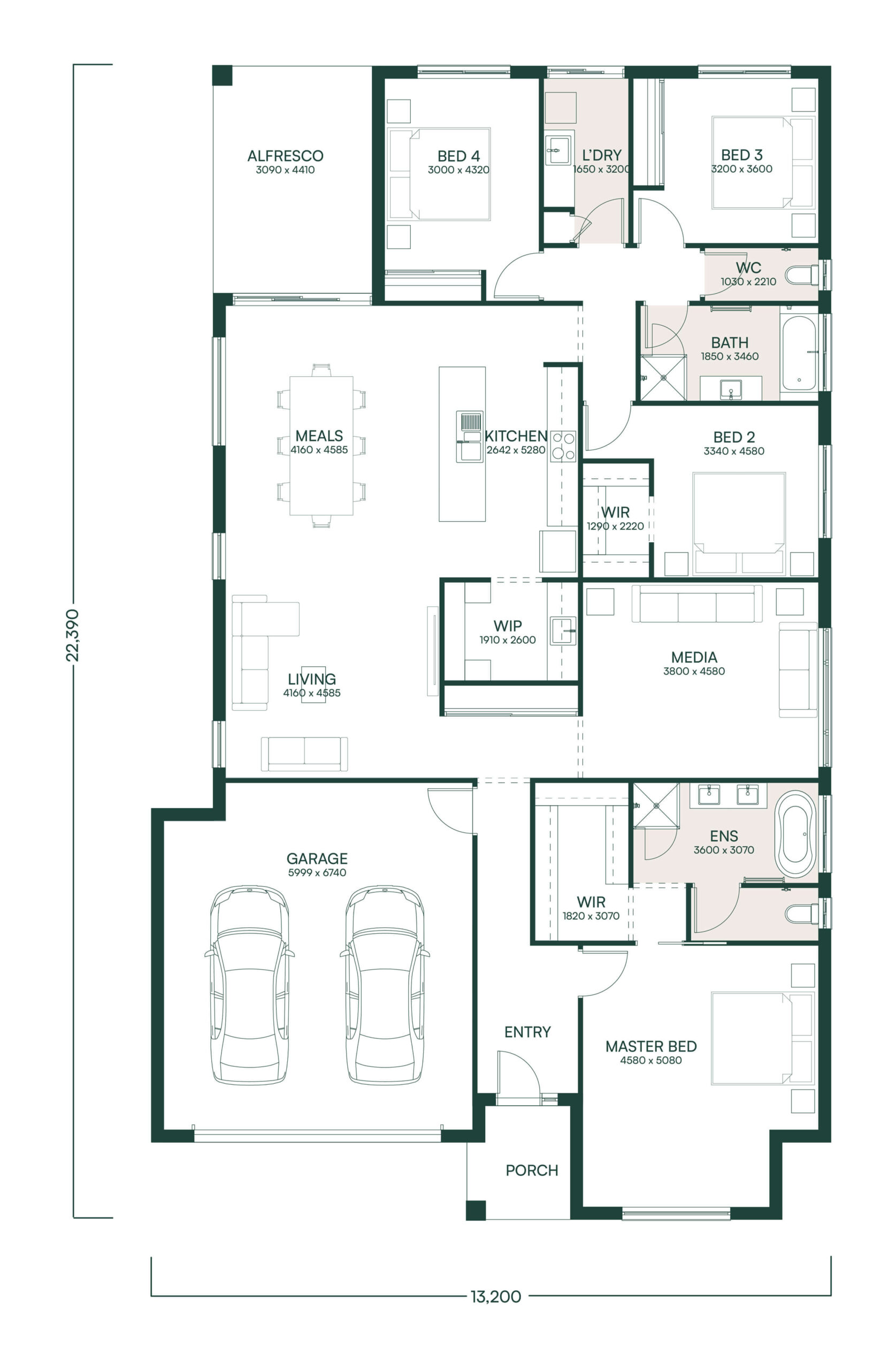 Our Banksia design is approx 268sqm, with a dedicated media room, living & dining areas, 4 bedrooms with Main bedroom with ensuite & generous outdoor alfresco.
