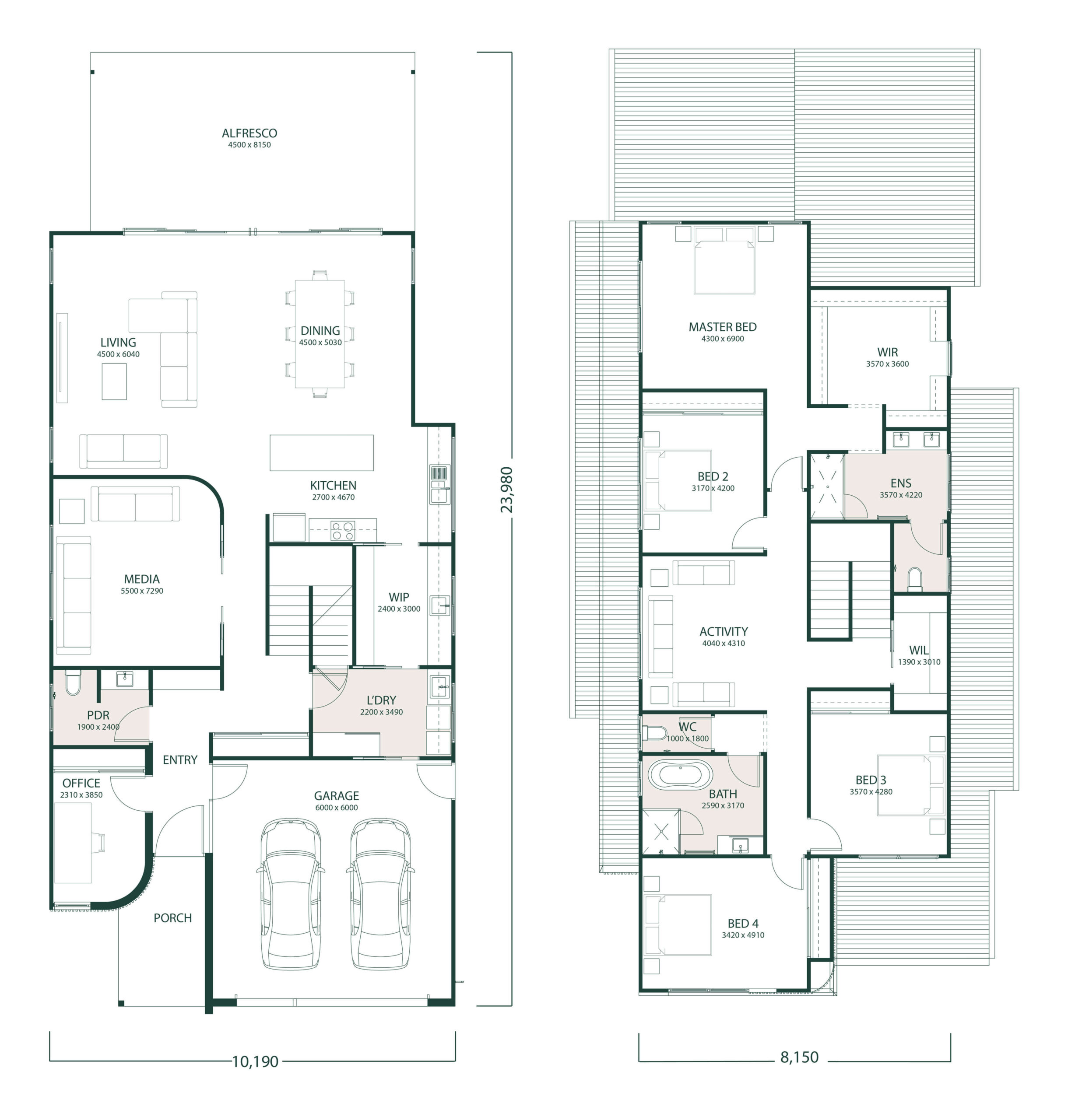 Our Belmorana design is approx 374sqm, 4 bedrooms with a dedicated Media Room, Activity Room, Study, open plan Living and large under cover Alfresco. Finished off with architectural elements such as curved walls & Palm Springs facade. Enhance your lifestyle with this this luxury home on premium waterfront land.